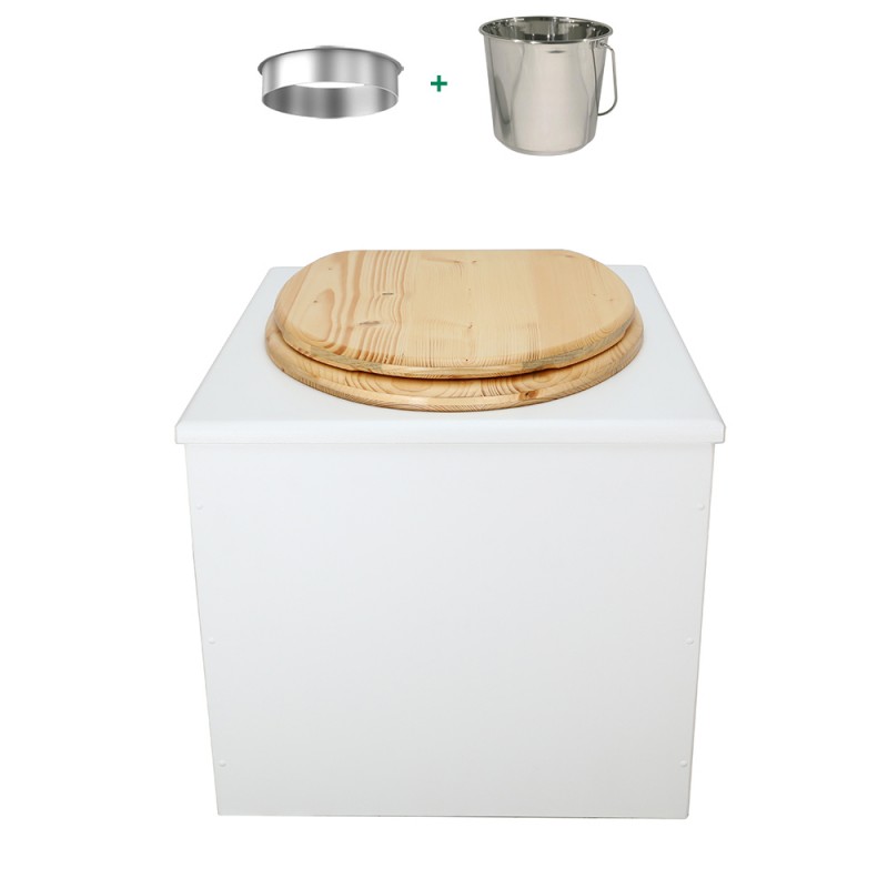 Toilette sèche en bois blanc (finition peinture blanche 3 couches), complète avec abattant en bois huilé, livrée avec seau inox 22 litres et bavette de protection inox